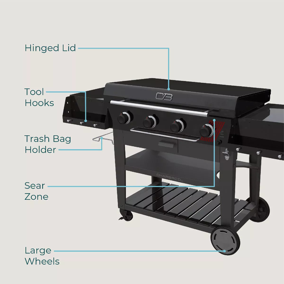 The Charbroil 36-inch Performance Series Deluxe 4-Burner Gas Griddle with Cart is for anyone serious about griddling. Whether it’s breakfast, lunch, or dinner our patent pending sear zone and TRU-Zonal cooking technology will help you up your game. Start the day with light and fluffy pancakes while simultaneously cooking crispy, crackling bacon in the independent cooking zones. Frozen hash browns – no worries, there’s no warping here. The cooktop was designed for optimal performance with fresh and frozen foods. When lunchtime rolls around, the built-in wind blockers will efficiently help you battle any unexpected wind to conserve fuel while maintaining high and even temps for smash burgers or tacos. Use the hinged cooking lid to melt cheese or steam veggies. Later, reach searing temperatures over 700 Deg F for steakhouse-quality results every time.
