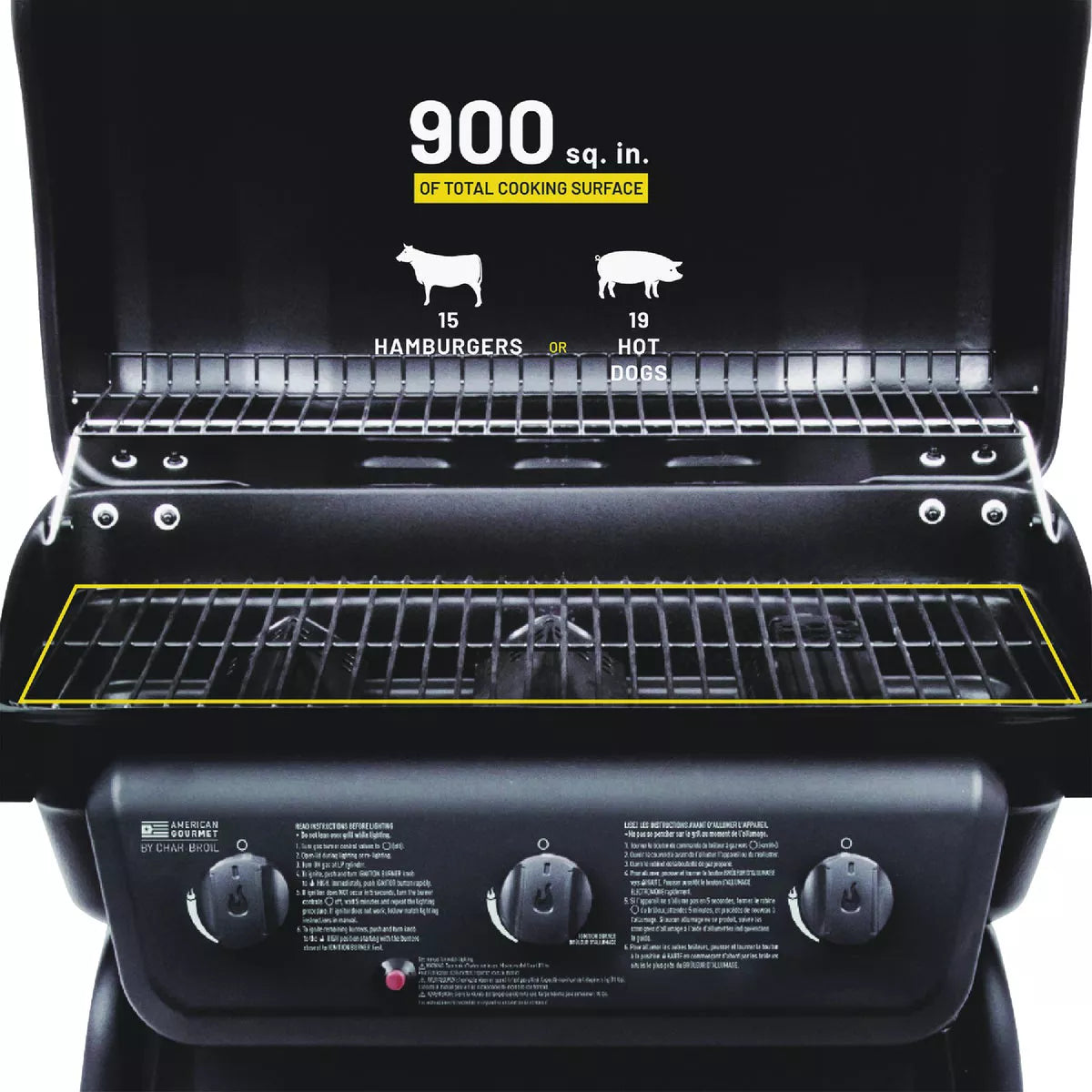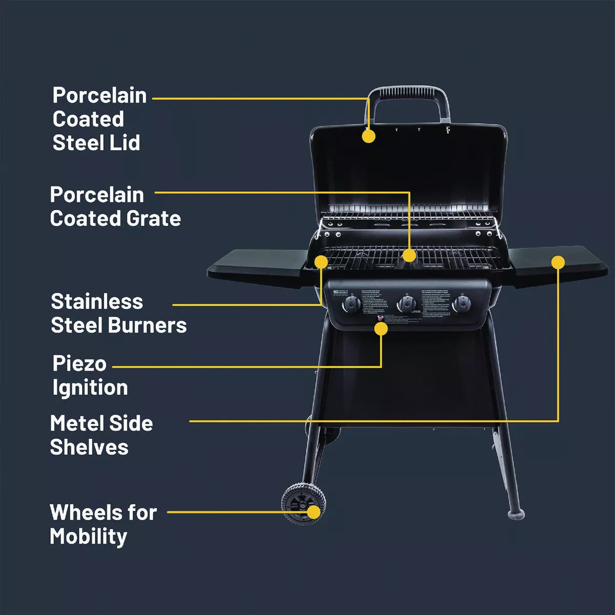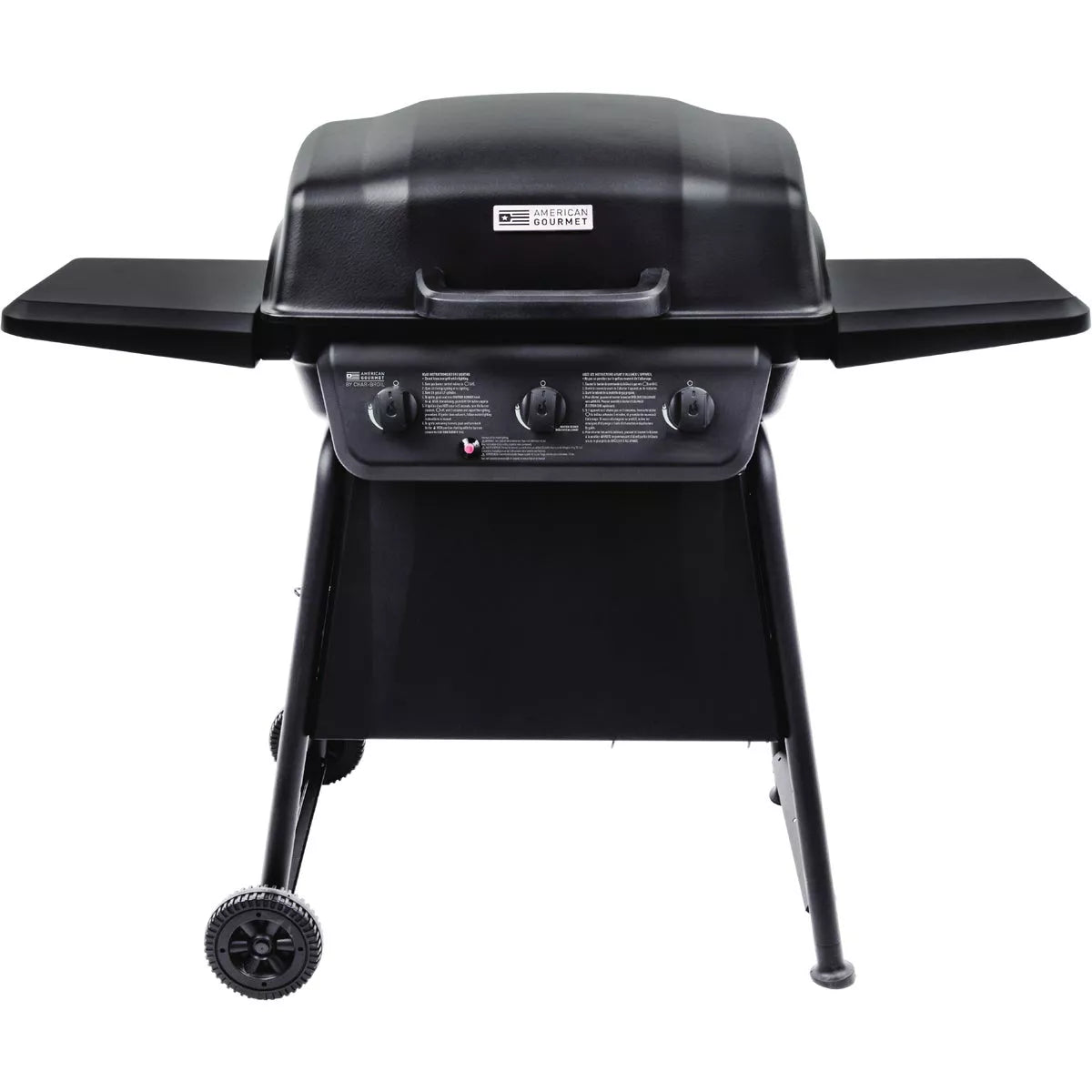 The American Gourmet Classic Series 3-Burner Gas Grill features 360 square inches of cooking space and 30,000 BTUs of cooking power. It’s a mid-size grill with stainless steel burners for even heat and a porcelain-coated cooking grate to prevent food from sticking. The lid and firebox are constructed from porcelain-coated steel to stand up to the elements and Piezo ignition ensures fast and reliable starts. It has a warming rack to keep your food warm and away from direct heat and two metal side shelves to hold your seasonings and toppings.
