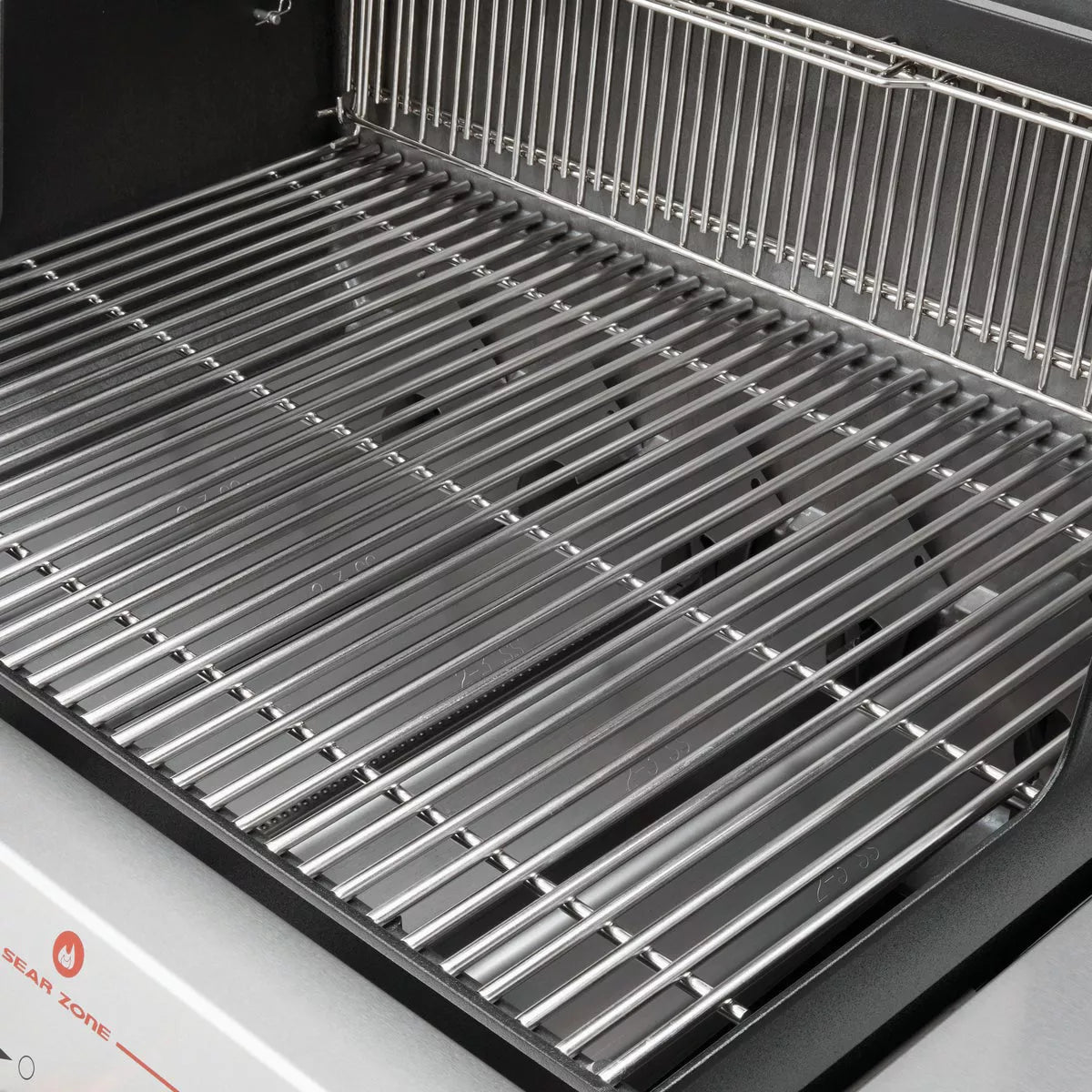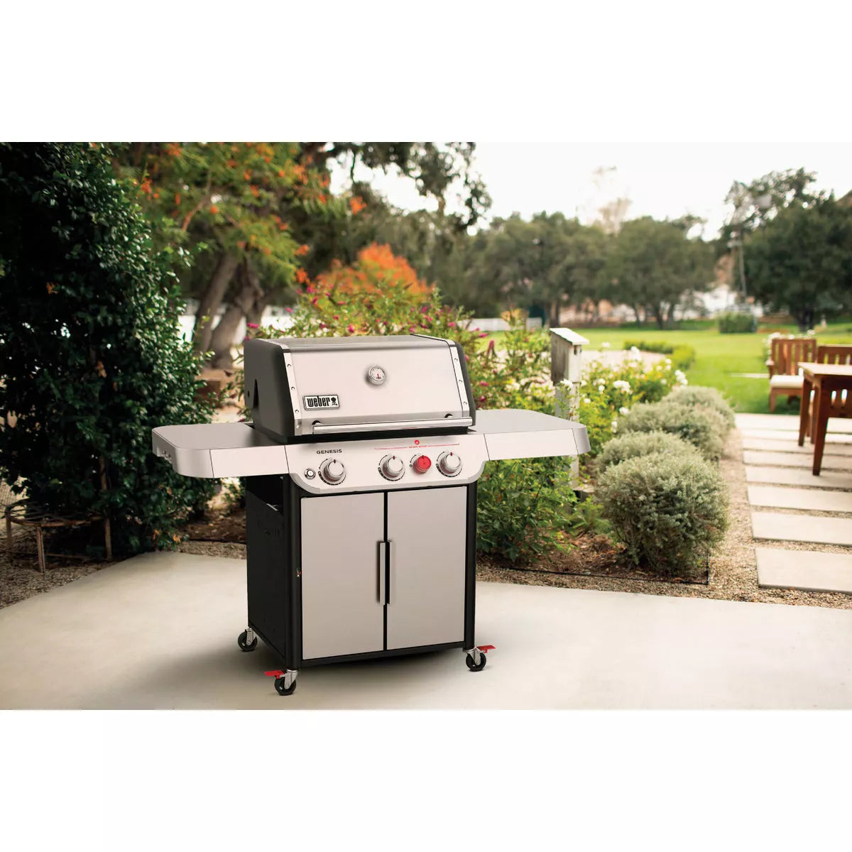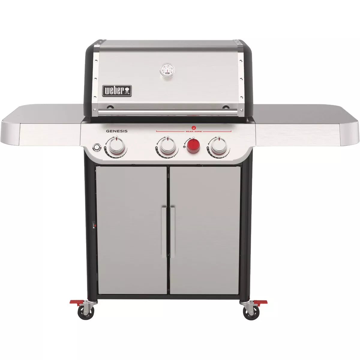 Genesis S-325S LP (liquid propane) gas grill with sear station. A great design that allows you to prep, sear, and serve everything outside, where the party is. Features a large and hot sear zone, with expandable top cooking grate so that the main course and sides are all grilled and served at the same time. Once food is ready, easily transfer it to the large prep and serve table, making for a seamless prep-to-serve grilling experience. 39,000 BTUs (British Thermal Unit), 7 mm stainless steel cooking grates, stainless steel Flavorizer bars, improved pull-out grease tray, stainless steel hood & doors. Compatible with Weber crafted frame and grillware (sold separately). 12-year limited warranty.