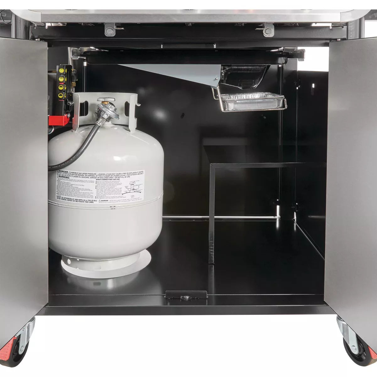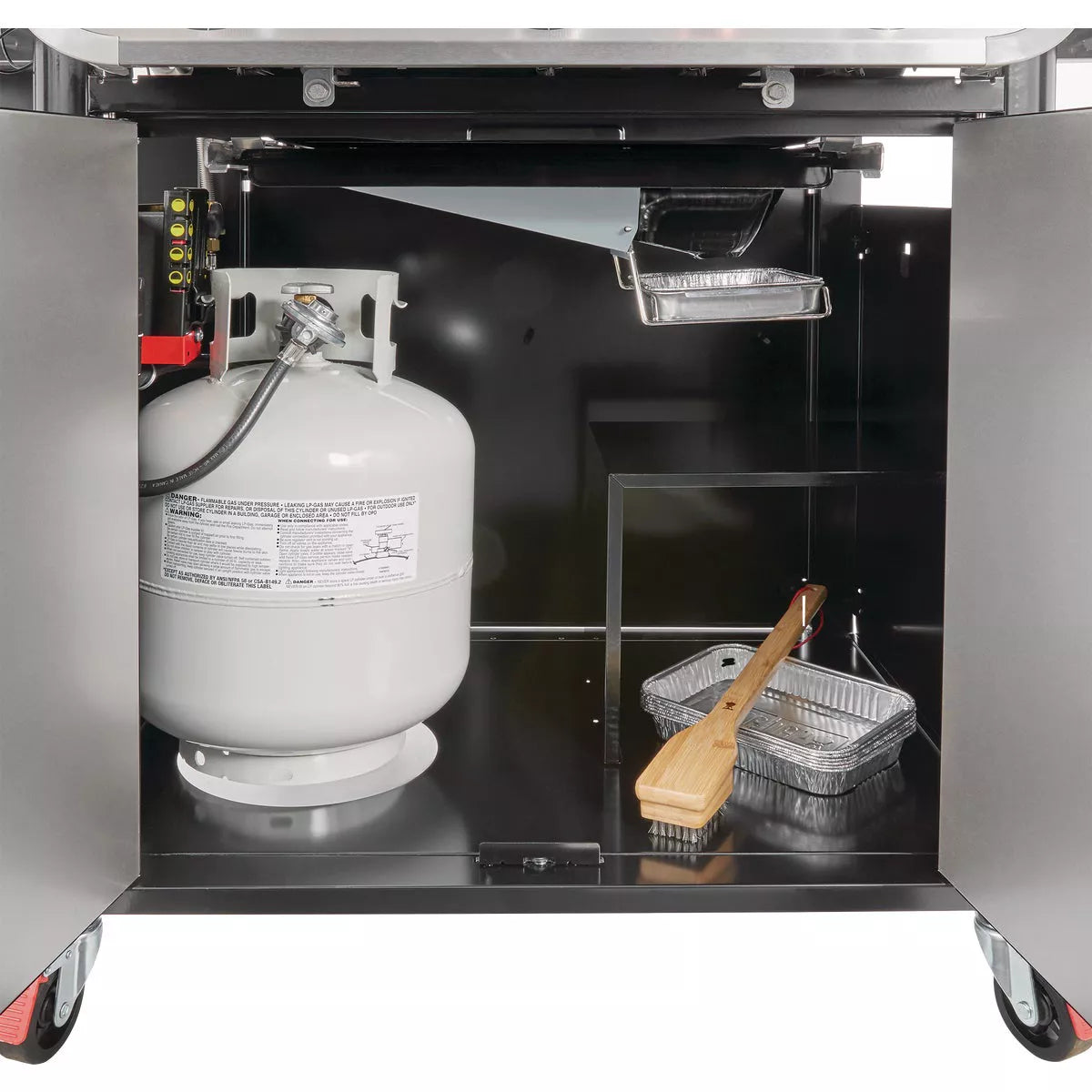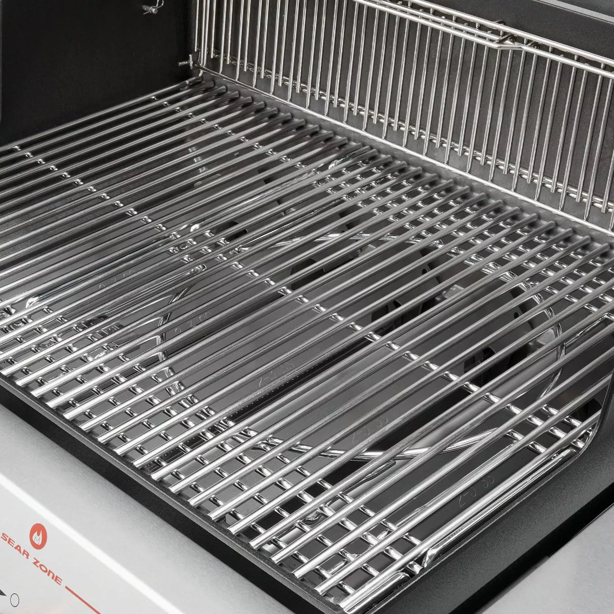 Genesis S-325S LP (liquid propane) gas grill with sear station. A great design that allows you to prep, sear, and serve everything outside, where the party is. Features a large and hot sear zone, with expandable top cooking grate so that the main course and sides are all grilled and served at the same time. Once food is ready, easily transfer it to the large prep and serve table, making for a seamless prep-to-serve grilling experience. 39,000 BTUs (British Thermal Unit), 7 mm stainless steel cooking grates, stainless steel Flavorizer bars, improved pull-out grease tray, stainless steel hood & doors. Compatible with Weber crafted frame and grillware (sold separately). 12-year limited warranty.