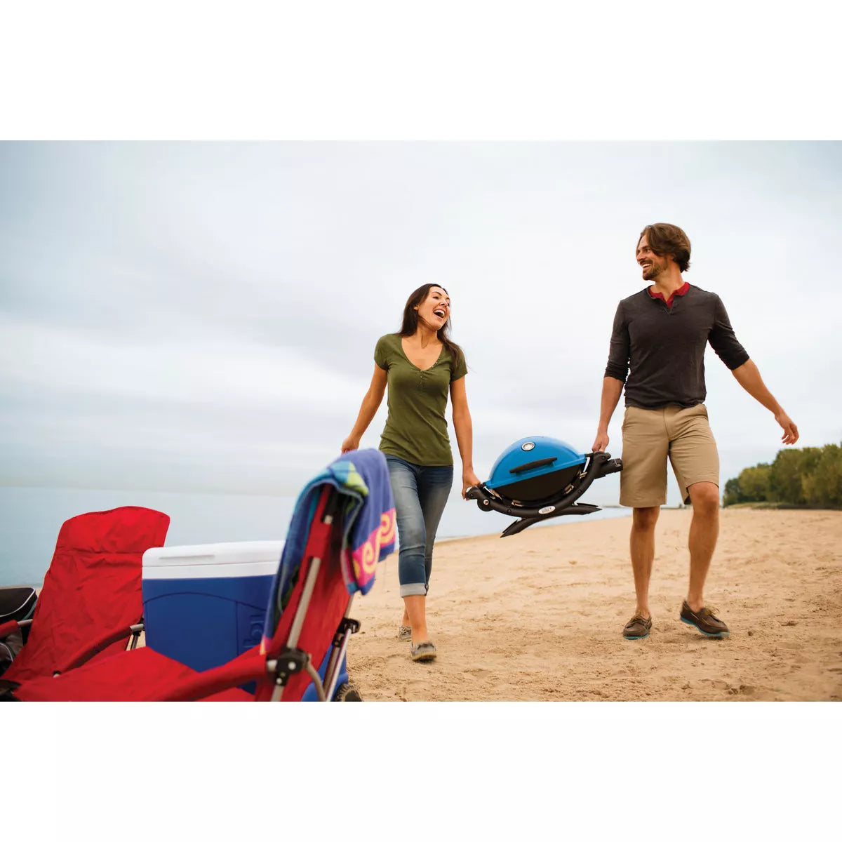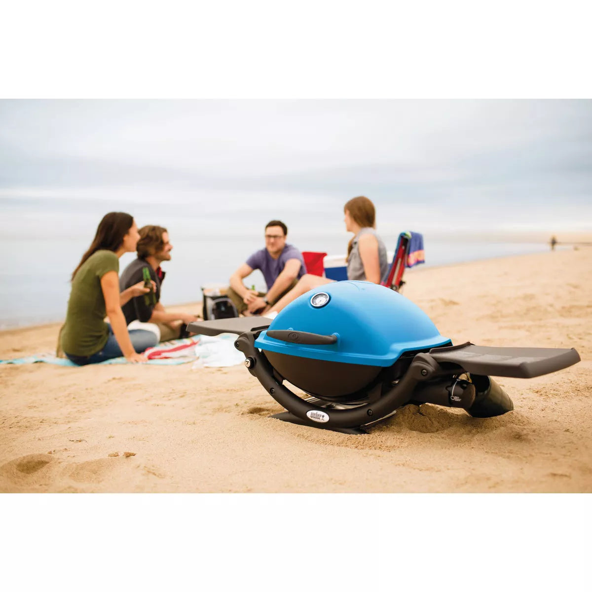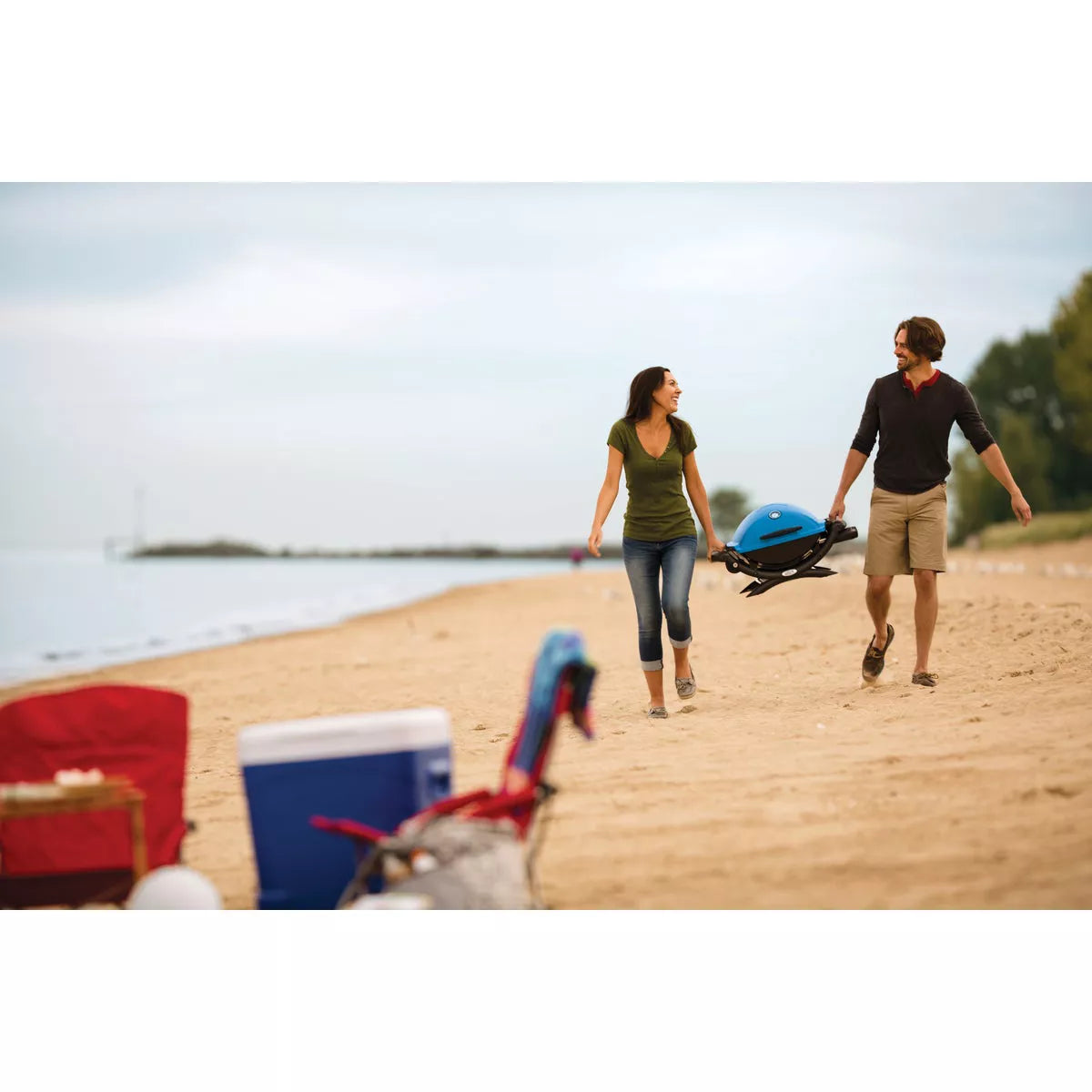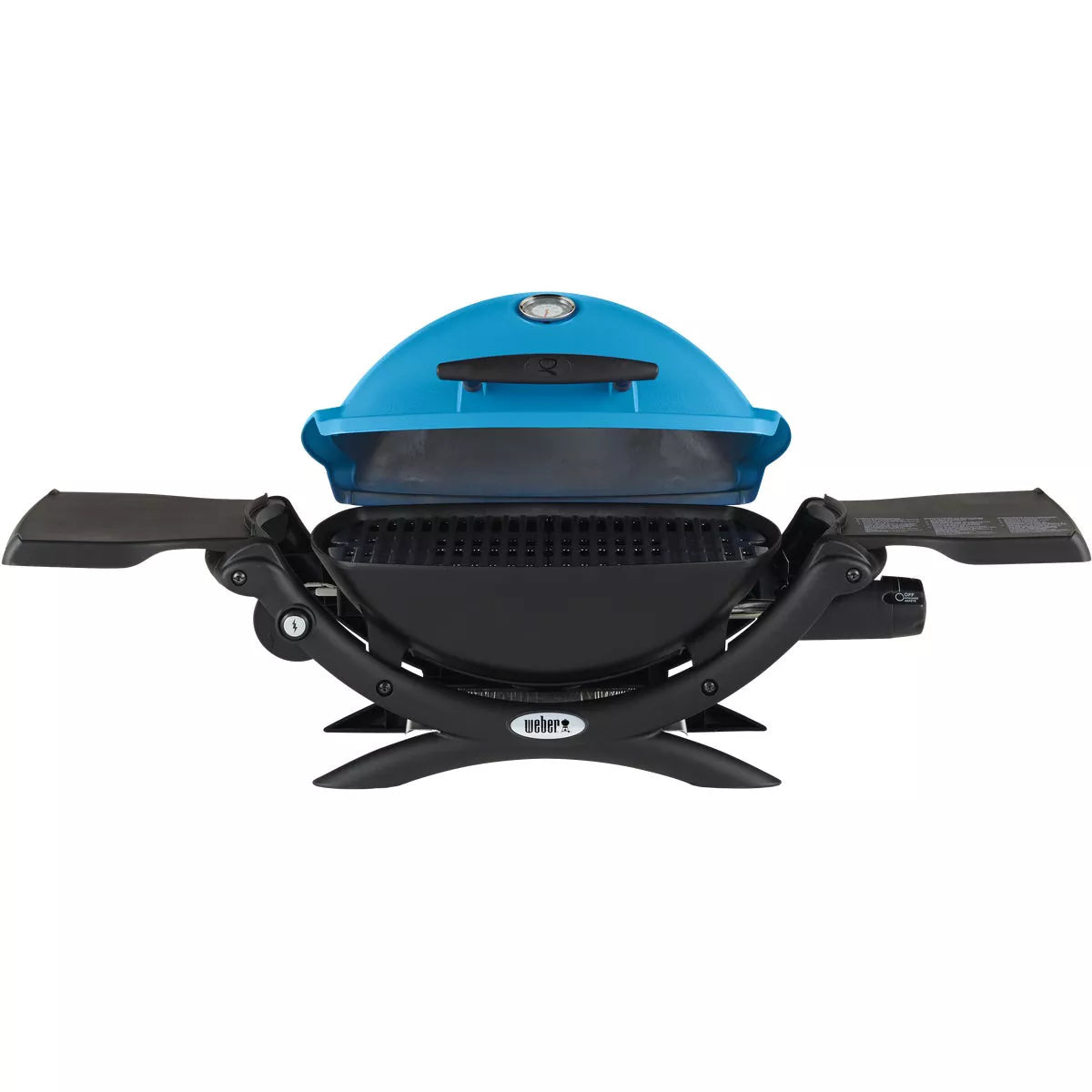 Portable gas grill ideal to take camping, tailgating, or to use for the next backyard cook-out. Features a durable cast aluminum lid and body with a glass-reinforced nylon frame. 189 Sq. In. of primary cooking area. Includes electronic ignition for easy lighting, stainless steel burner tube, porcelain-enameled cast-iron cooking grates, infinite control burner valve, built-in thermometer, 2 folding work tables, and removable catch pan. Uses disposable 14.1 or 16.4 Oz. LP cylinder (sold separately) fuel. Requires (1) AAA battery.
