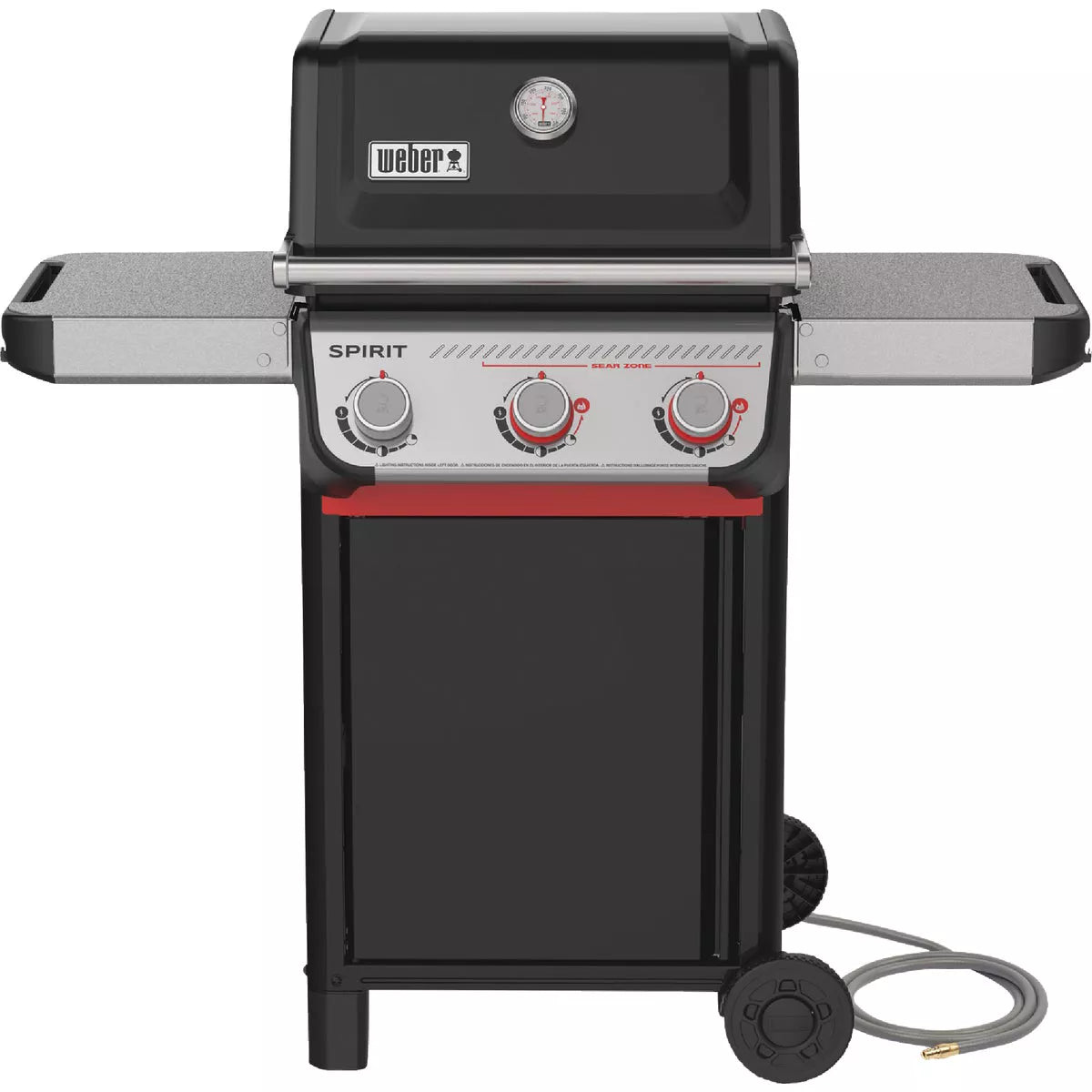 Grill food that tastes better than ever on the reinvented 3-burner Spirit E-325 Gas Grill with Sear Zone. Create bold, flavorful sear marks on meat, fish, and vegetables with two red Boost Burner knobs that unleash 40% more power in the Sear Zone. Ignite each individual burner easily with one hand with Snap-Jet Ignition and control the heat precisely with a full range of temperatures from high to low and everything in between. Make the most of your space by adding a variety of Weber Works snap-on accessories (sold separately) to the side rails. Keep platters, seasonings, and tools within reach with hammertone metal side tables that conveniently fold down to fit smaller spaces. Porcelain-enameled lid retains heat and the high quality material protects your grill from the elements. Porcelain-enameled, cast iron cooking grates offer superior heat retention, flavor infusion and an attractive appearance as you elevate your grilling experience with these high-quality cooking grates. Stainless steel flavorizer bars enhance grilling by vaporizing food drippings, creating flavorful smoke and contributing to even heat distribution while minimizing flare-ups and promoting easy maintenance.