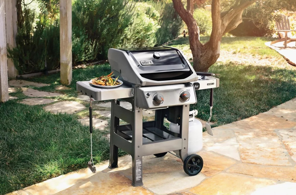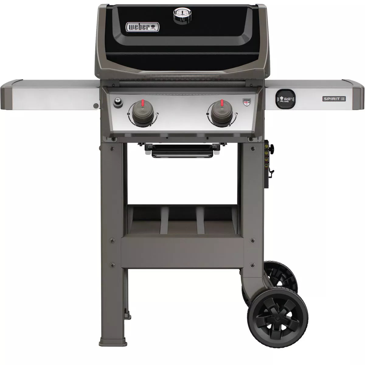 Weber Spirit II E-210 LP Gas Grill has 26,500 BTU, GS4 Grilling System includes 2 high performance stainless steel burners, Infinity Electronic ignition, grease management system, and porcelain enameled flavorizer bars. Porcelain enameled cast iron cooking grates provide 360 Sq. In. of cooking space and warming rack adds an additional 90 Sq. In. for a total cooking area of 450 Sq. In. Features: porcelain enameled lid with center mounted thermometer, side tables with built-in tool hooks – the left shelf folds down, and welded tube design with open cart and bottom shelf. Easy access to gas tank storage with fuel gauge. Wheels for easy mobility. 10 year warranty on GS4 Grilling System, 5 year warranty on porcelain enameled cast iron grates and porcelain flavorizer bars. iGrill compatible (sold separately).